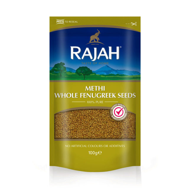 Rajah Methi Whole Fenugreek Seeds 100g is a pack of whole fenugreek seeds, known for their slightly bitter, nutty flavor. These seeds are commonly used in Indian and Middle Eastern cooking, enhancing curries, stews, spice blends, and pickles. The 100g pack is perfect for home cooks who want to add a distinctive, aromatic flavor to their dishes.